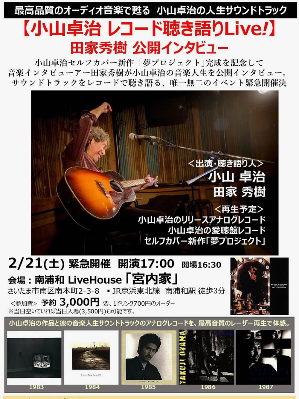 ■ オフィシャルストア 配信チケット・CD・DVD 販売 ▶︎ 2026年 FaceBook LIVE SCHEDULE ▶︎ 2026年 LIVE SCHEDULE ■ 2026年2月28日(土) さいたま市 ライブ&カフェ 宮内家 〈小山卓治レコード聴き語りLive ! 田家秀樹公開インタビュー〉 〈出演・聴き語り人〉小山卓治 田家秀樹 ■ 2026年2月28日(土) 名古屋 栄 Brushup 〈夢プロジェクト 新アルバム レコ発ライヴ featuring 西本明, 長田進〉 小山卓治(Vo / Gt)西本明(Pf)長田進(Gt) ■ 2026年3月1日(日) 東京 西荻窪 Live Spot Terra 〈夢プロジェクト 新アルバム レコ発ライヴ featuring 西本明, 長田進〉 小山卓治(Vo / Gt)西本明(Pf)長田進(Gt) ※東京会場チケット完売! Thank you sold out! ■ 2026年3月14日(土) 広島 OTIS! 〈小山卓治 ワンマンライヴ 2026 春〉 ■ 2026年3月15日(日) 福岡 Live & Bar RED HOUSE 〈小山卓治 ワンマンライヴ 2026 春〉 ■ 2026年3月20日(金・祝) 東京 新宿御苑 ライブ&バーRuto 〈Takuji Oyama 43rd Anniversary Live〉 with Wonder2(信夫正彦, ストウタカシ) ■ 2026年4月4日(土) 島根県松江市 Retrock Bar Poisson (レトロックバー ポワソン) 〈Takuji Oyama 43rd Anniversary Live〉 O.A 狩野悟司 ■ 2026年4月5日(日) 鳥取県米子市 music bar Hana Hana 〈Takuji Oyama 43rd Anniversary Live〉 O.A 井上瞬也 ■ 2026年4月11日(土) 阿佐ヶ谷harness 〈熊本応援ライヴ ひとまずラスト〉 ■ 2026年4月18日(土) 富山市 ROCK BAR WILDSIDE 〈小山卓治 ワンマンライヴ -The last prefecture-〉 ■ 2026年4月19日(日) 大阪 music bar S.O.Ra 〈小山卓治 ワンマンライヴ 2026 春〉 ■ 2026年4月25日(土) 東京 西荻窪 Live Spot Terra 〈松藤英男 × 小山卓治 with 磯部舞子(ベチコ)LIVE 2026〉 ■ 2026年5月6日(水祝) 神奈川 新横浜 LiT 〈Takuji Oyama with Wonder5・43rd Anniversary Live〉 ■ 2026年5月9日(土) 東京 小平市 一橋学園 ROLLING BEANS 〈こくフェスプレゼンツ よしだよしこ, 小山卓治 2マンライヴ〉 出演:よしだよしこ、小山卓治 ■ 2026年5月16日(土) 東京 阿佐ヶ谷 harness 〈小山卓治 × 河村博司〉 ■ 2026年6月6日(土) 沖縄 那覇 Live Music Bar SOUND M'S (サウンド エムズ) 〈小山卓治 アコースティックライヴ 2026 OKINAWA〉 ゲスト:島山信和(gt) ■ 2026年6月27日(土) 東京 Club GOODMAN 〈小山卓治 × 森純太〉