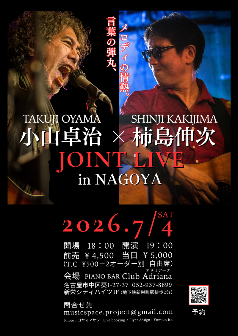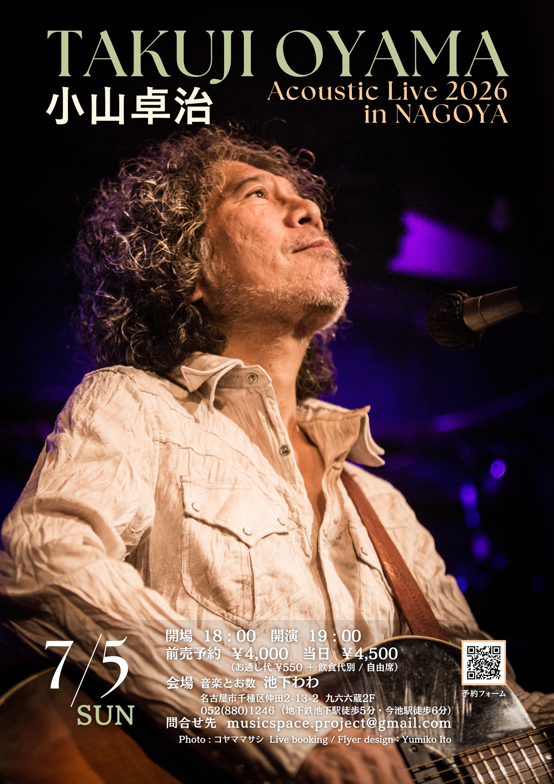 ■ オフィシャルストア 配信チケット・CD・DVD 販売 ▶︎ 2025年 FaceBook LIVE SCHEDULE ▶︎ 2025年 LIVE SCHEDULE ■ 2025年12月20日(土) 鳥取 米子市 Hi !High?Pecadoss(ハイハイ ピカドス) 〈小山卓治 × 松藤英男 with 西本明 SPECIAL LIVE〉 『小山卓治・夢プロジェクト』アルバム制作記念 ■ 2025年12月30日(火) 東京 江古田 マーキー 〈小山卓治 with SMILEY〉 ~マーキー初出演㊗️25周年記念公演~ ■ 2026年1月10日(土) 東京 新宿御苑 ライブ&バー Ruto 〈Thank You! 2025 & Hello 2026 New Year Live〉 ■ 2026年1月23日(金) 横浜 白楽 珈琲文明 〈小山卓治ワンマンライヴ〉 オープニングアクト:赤澤智(あかざわさとる) ※チケット完売いたしました Thank you sold out! ■ 2026年1月31日(土) 東京 阿佐ヶ谷harness 〈小山卓治 × 白浜久〉 ■ 2026年2月8日(日) 東京 Club GOODMAN 〈TAKUJI, HISASHI & TOBEN 2026 at Tokyo〉 小山卓治, 白浜久, 湯川トーベン ■ 2026年2月28日(土) 名古屋 栄 Brushup 〈夢プロジェクト 新アルバム レコ発ライヴ featuring 西本明, 長田進〉 小山卓治(Vo / Gt)西本明(Pf)長田進(Gt) ■ 2026年3月1日(日) 東京 西荻窪 Live Spot Terra 〈夢プロジェクト 新アルバム レコ発ライヴ featuring 西本明, 長田進〉 小山卓治(Vo / Gt)西本明(Pf)長田進(Gt) ■ 2026年3月14日(土) 広島 OTIS! 〈小山卓治 ワンマンライヴ 2026 春〉 ■ 2026年3月15日(日) 福岡 Live & Bar RED HOUSE 〈小山卓治 ワンマンライヴ 2026 春〉 ■ 2026年3月20日(金・祝) 東京 新宿御苑 ライブ&バーRuto 〈Takuji Oyama 43rd Anniversary Live〉 with Wonder2(信夫正彦, ストウタカシ) ■ 2026年4月11日(土) 阿佐ヶ谷harness 〈熊本応援ライヴ ひとまずラスト〉 ■ 2026年4月18日(土) 富山市 ROCK BAR WILDSIDE 〈小山卓治 ワンマンライヴ -The last prefecture-〉 ■ 2026年4月19日(日) 大阪 music bar S.O.Ra 〈小山卓治 ワンマンライヴ 2026 春〉 ■ 2026年5月6日(水祝) 神奈川 新横浜 LiT 〈Takuji Oyama with Wonder5・43rd Anniversary Live〉