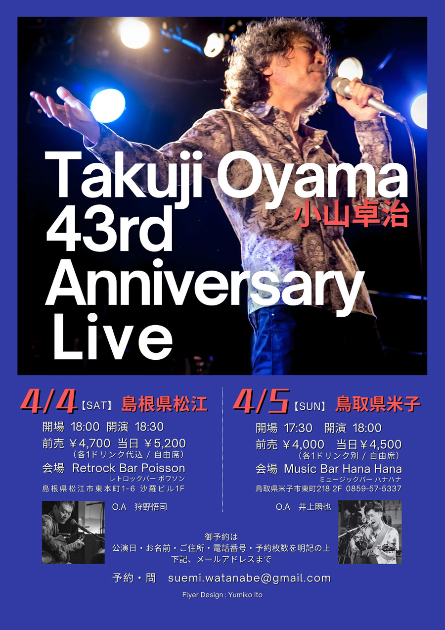 ■ オフィシャルストア 配信チケット・CD・DVD 販売 ▶︎ 2026年 FaceBook LIVE SCHEDULE ▶︎ 2026年 LIVE SCHEDULE ■ 2026年2月8日(日) 東京 Club GOODMAN 〈TAKUJI, HISASHI & TOBEN 2026 at Tokyo〉 小山卓治, 白浜久, 湯川トーベン ■ 2026年2月28日(土) 名古屋 栄 Brushup 〈夢プロジェクト 新アルバム レコ発ライヴ featuring 西本明, 長田進〉 小山卓治(Vo / Gt)西本明(Pf)長田進(Gt) ■ 2026年3月1日(日) 東京 西荻窪 Live Spot Terra 〈夢プロジェクト 新アルバム レコ発ライヴ featuring 西本明, 長田進〉 小山卓治(Vo / Gt)西本明(Pf)長田進(Gt) ※東京会場チケット完売! Thank you sold out! ■ 2026年3月14日(土) 広島 OTIS! 〈小山卓治 ワンマンライヴ 2026 春〉 ■ 2026年3月15日(日) 福岡 Live & Bar RED HOUSE 〈小山卓治 ワンマンライヴ 2026 春〉 ■ 2026年3月20日(金・祝) 東京 新宿御苑 ライブ&バーRuto 〈Takuji Oyama 43rd Anniversary Live〉 with Wonder2(信夫正彦, ストウタカシ) ■ 2026年4月4日(土) 島根県松江市 Retrock Bar Poisson (レトロックバー ポワソン) 〈Takuji Oyama 43rd Anniversary Live〉 O.A 狩野悟司 ■ 2026年4月5日(日) 鳥取県米子市 music bar Hana Hana 〈Takuji Oyama 43rd Anniversary Live〉 O.A 井上瞬也 ■ 2026年4月11日(土) 阿佐ヶ谷harness 〈熊本応援ライヴ ひとまずラスト〉 ■ 2026年4月18日(土) 富山市 ROCK BAR WILDSIDE 〈小山卓治 ワンマンライヴ -The last prefecture-〉 ■ 2026年4月19日(日) 大阪 music bar S.O.Ra 〈小山卓治 ワンマンライヴ 2026 春〉 ■ 2026年4月25日(土) 東京 西荻窪 Live Spot Terra 〈松藤英男 × 小山卓治 with 磯部舞子(ベチコ)LIVE 2026〉 ■ 2026年5月6日(水祝) 神奈川 新横浜 LiT 〈Takuji Oyama with Wonder5・43rd Anniversary Live〉 ■ 2026年5月9日(土) 東京 小平市 一橋学園 ROLLING BEANS 〈こくフェスプレゼンツ よしだよしこ, 小山卓治 2マンライヴ〉 出演:よしだよしこ、小山卓治 ■ 2026年5月16日(土) 東京 阿佐ヶ谷 harness 〈小山卓治 × 河村博司〉 ■ 2026年6月6日(土) 沖縄 那覇 Live Music Bar SOUND M'S (サウンド エムズ) 〈小山卓治 アコースティックライヴ 2026 OKINAWA〉 ゲスト:島山信和(gt) ■ 2026年6月27日(土) 東京 Club GOODMAN 〈小山卓治 × 森純太〉