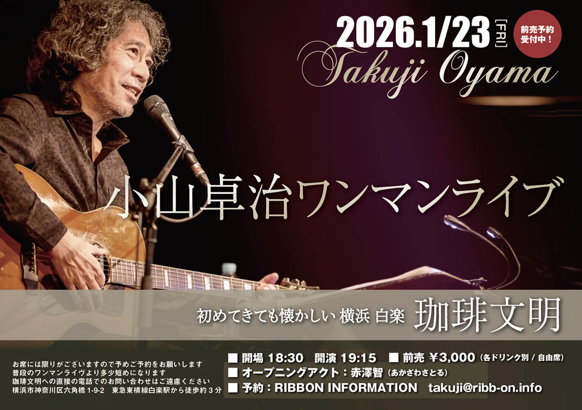 初めてきても懐かしい 横浜 白楽 珈琲文明〈小山卓治ワンマンライヴ〉◻︎オープニングアクト 赤澤智 2026.1/23 横浜 白楽 珈琲文明